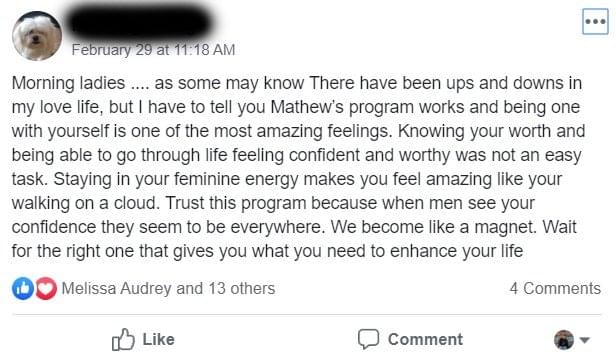 It has benefited my life a lot. I have learned how to talk to guys in general and one specific and special man is my goal in keeping close to me. He is interested in keeping the flames burning with me as well. Thanks to this program."